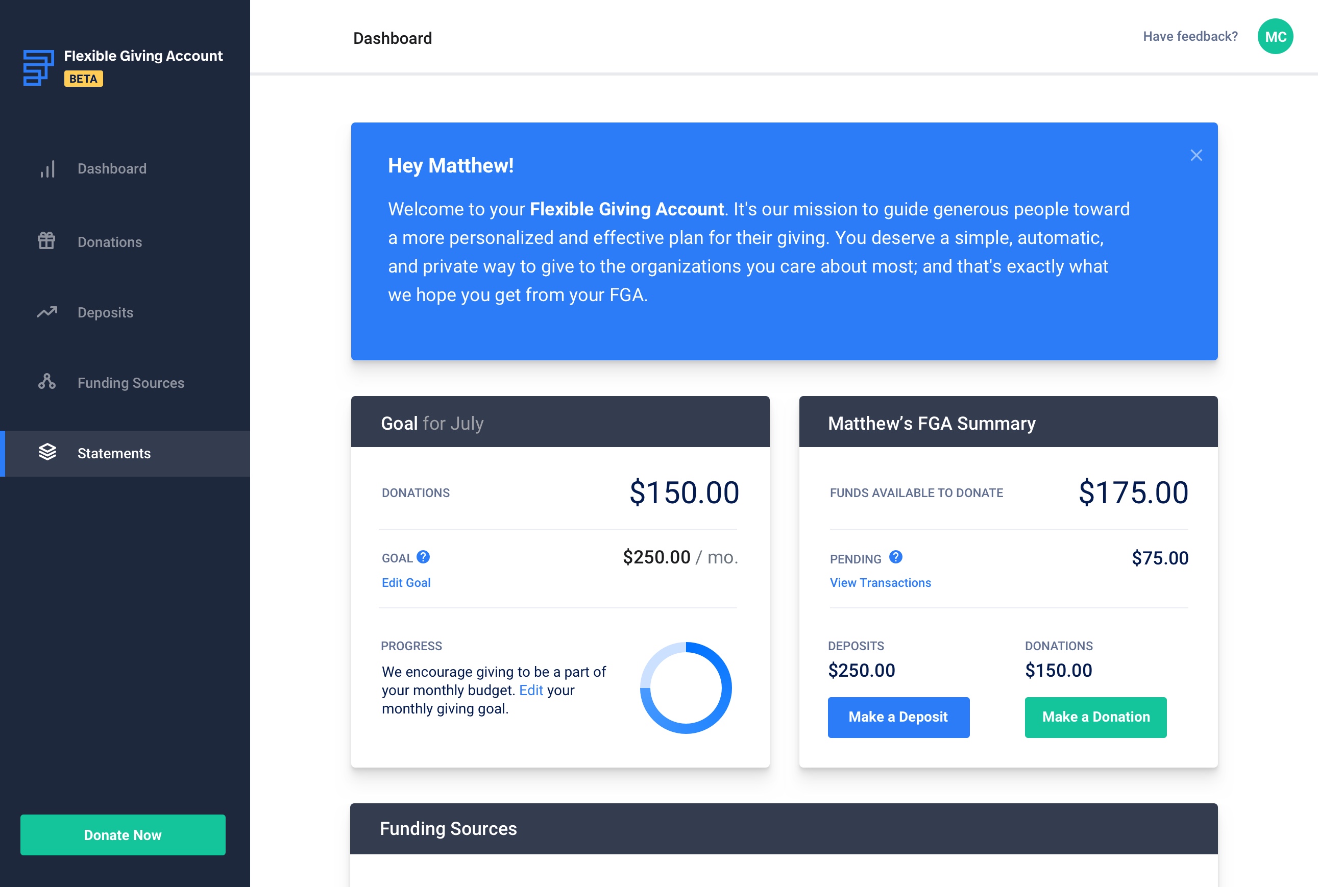 Learn moreOpen a Flexible Giving Account to simplify, manage, and budget your donations to over 2,000 nonprofits. Add funds and make your first donation in under 5 minutes. No fees, no paperwork, no pledging, and complete privacy. It's the way giving should be.